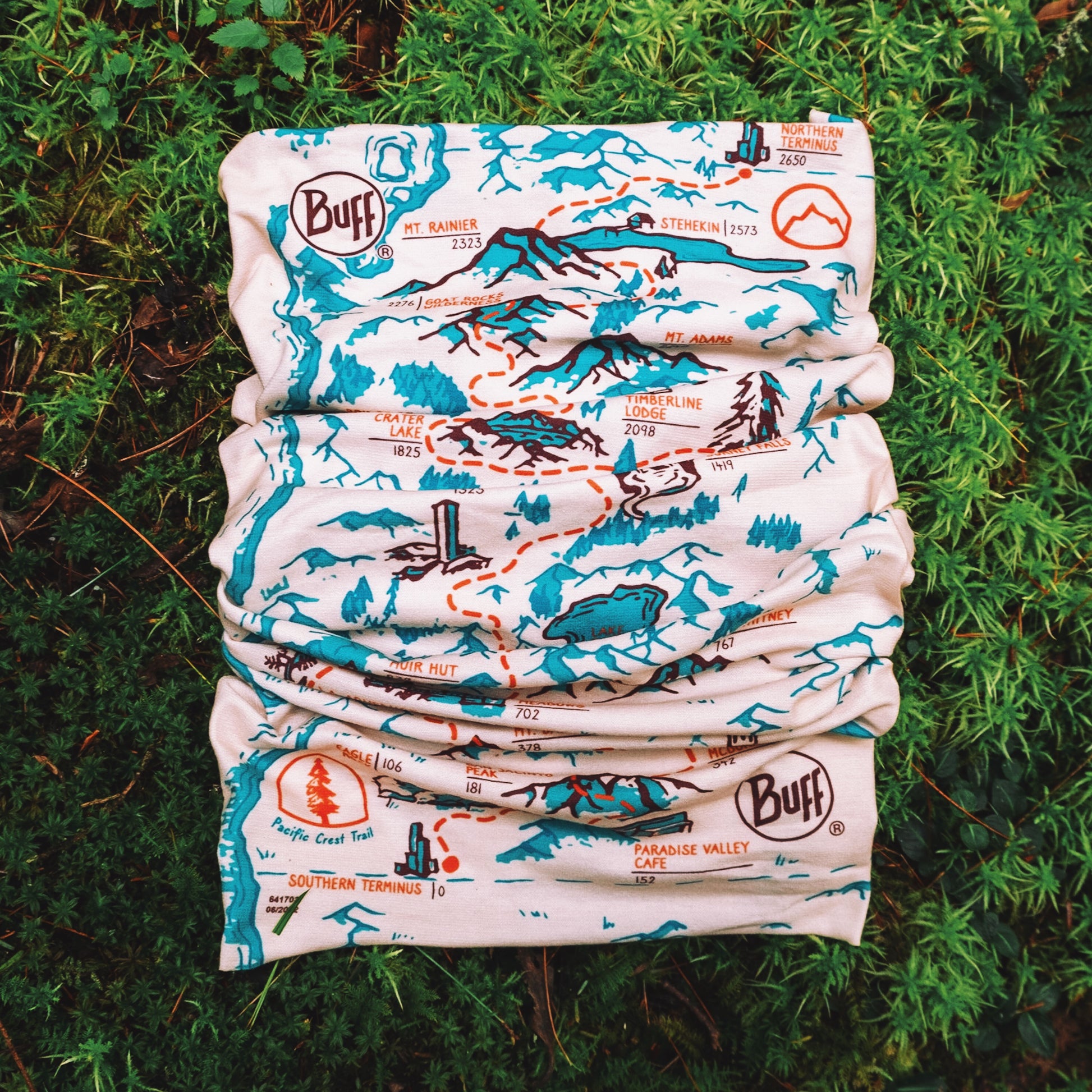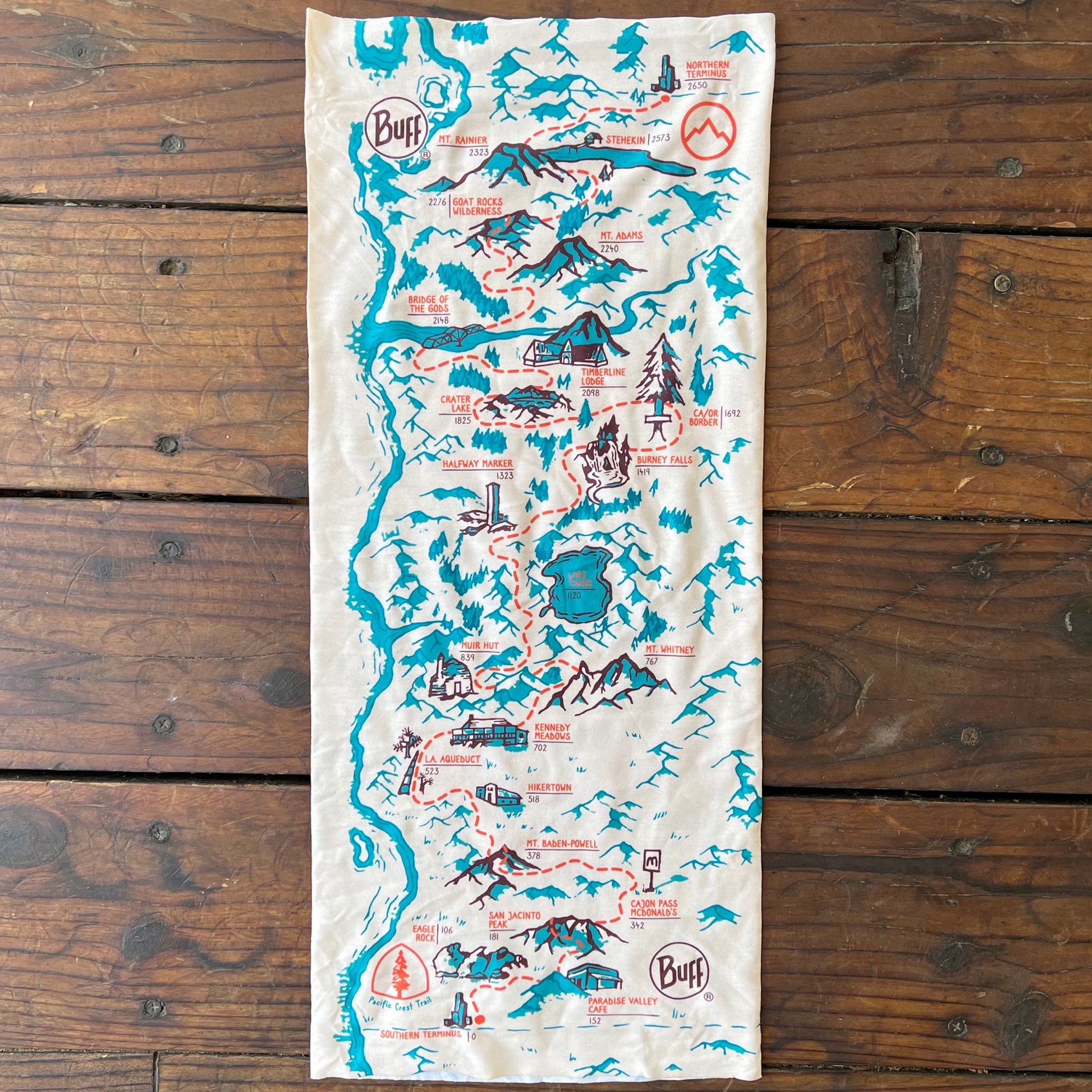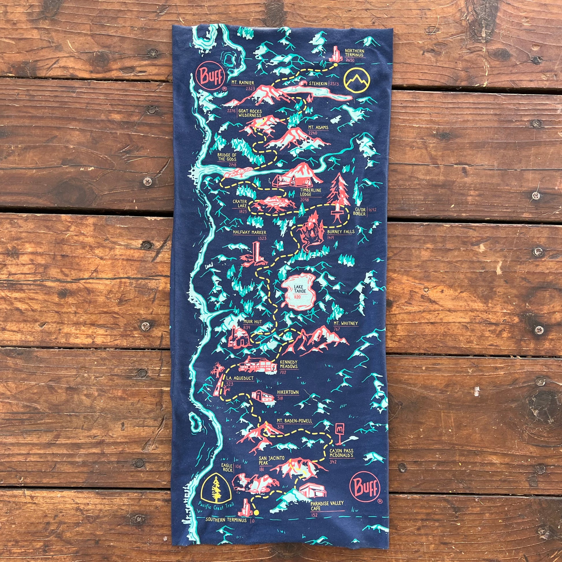 The Trek's PCT Map BUFF® Original Multifunctional Neckwear includes but a handful of our favorite stops along the PCT. This design is a fun twist on a PCT map, highlighting many standout spots along the iconic Mexico <> Canada footpath, including The Southern Terminus, Eagle Rock, Paradise Valley Cafe, San Jacinto, Cajon Pass McDonald's, Mt Baden-Powell, Hikertown, LA Aqueduct, Kennedy Meadows, Mt Whitney, Muir Hut, Lake Tahoe, Halfway Marker, Burney Falls, California / Oregon Border, Crater Lake, Timberline Lodge, Bridge of the Gods, Mt Adams, Goat Rocks Wilderness, Mt Rainier, Stehekin, and the Northern Terminus.
